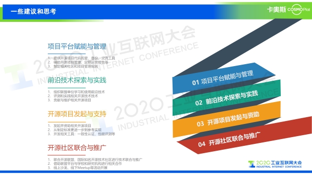 “給大家一些在開(kāi)源領(lǐng)域?qū)用娴慕ㄗh和思考。第一,項(xiàng)目平臺(tái)實(shí)現(xiàn)賦能與管理,要提供開(kāi)源項(xiàng)目代碼托管、備份、交流的工具,通過(guò)一些工具來(lái)完善并且促進(jìn)我們開(kāi)源項(xiàng)目的管理。第二,輔助開(kāi)源項(xiàng)目管理,要定期關(guān)注運(yùn)營(yíng)報(bào)告,同時(shí)要制定社區(qū)和整個(gè)項(xiàng)目的管理規(guī)則。第三,發(fā)起開(kāi)源項(xiàng)目,支持開(kāi)源項(xiàng)目,要從制定標(biāo)準(zhǔn)、開(kāi)發(fā)工具,一致性認(rèn)證、性能測(cè)評(píng)等等方面來(lái)推進(jìn)。最后,開(kāi)源社區(qū)的聯(lián)合與推廣,要做到產(chǎn)學(xué)研各個(gè)層面的聯(lián)合。開(kāi)源不僅僅是源碼的開(kāi)源,更重要的是我們要做到生態(tài)的建設(shè)。只有這樣,才能實(shí)現(xiàn)開(kāi)源的真正推廣與落地。