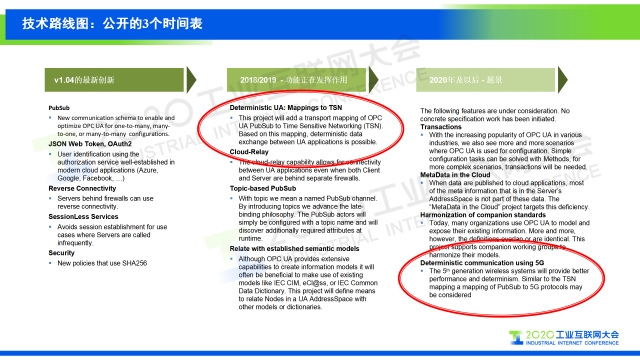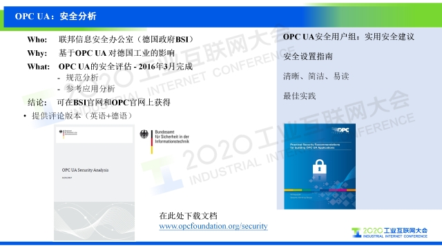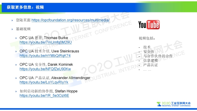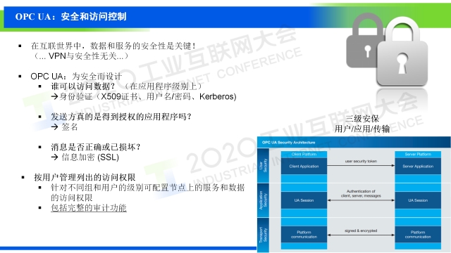 點擊下方鏈接,觀看演講視頻 專家說 “OPC UA是一個擁有良好互操作性的標準,它為用戶提供了安全和標準化的信息和接口,很多會員也好,供應商也好,終端用戶也好,使用OPC UA是因為它能夠很好的實現跨供應商的數據交互。同樣,OPC UA的開放性也可以使這些終端用戶為未來即將到來的技術實現做好準備。OPC UA通過三種方式來保障信息安全,即信息加密、身份識別、權限管理,與操作系統大致相似,所以OPC UA也被稱為是能夠提供系統級安全防護的標準。總的來說,OPC UA讓機器擁有信息模型,通過信息模型擁有自我描述的能力,從而能夠極大的減少配置工作,降低工程成本。” 以下是演講PPT 敬請閱讀