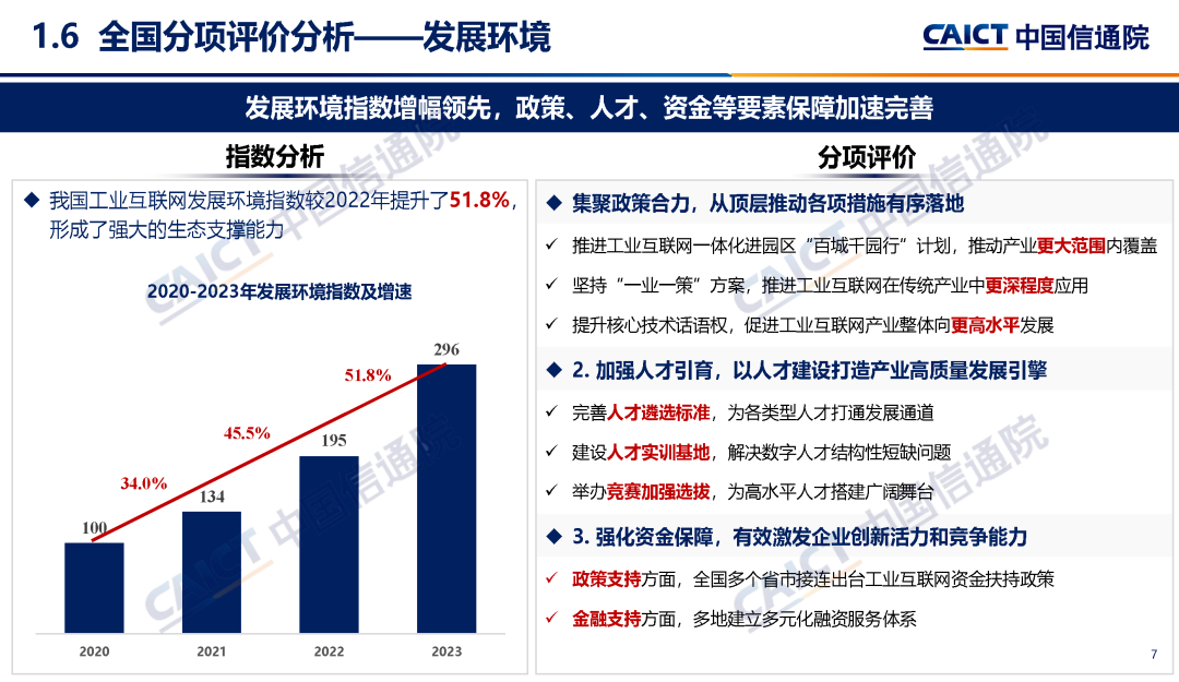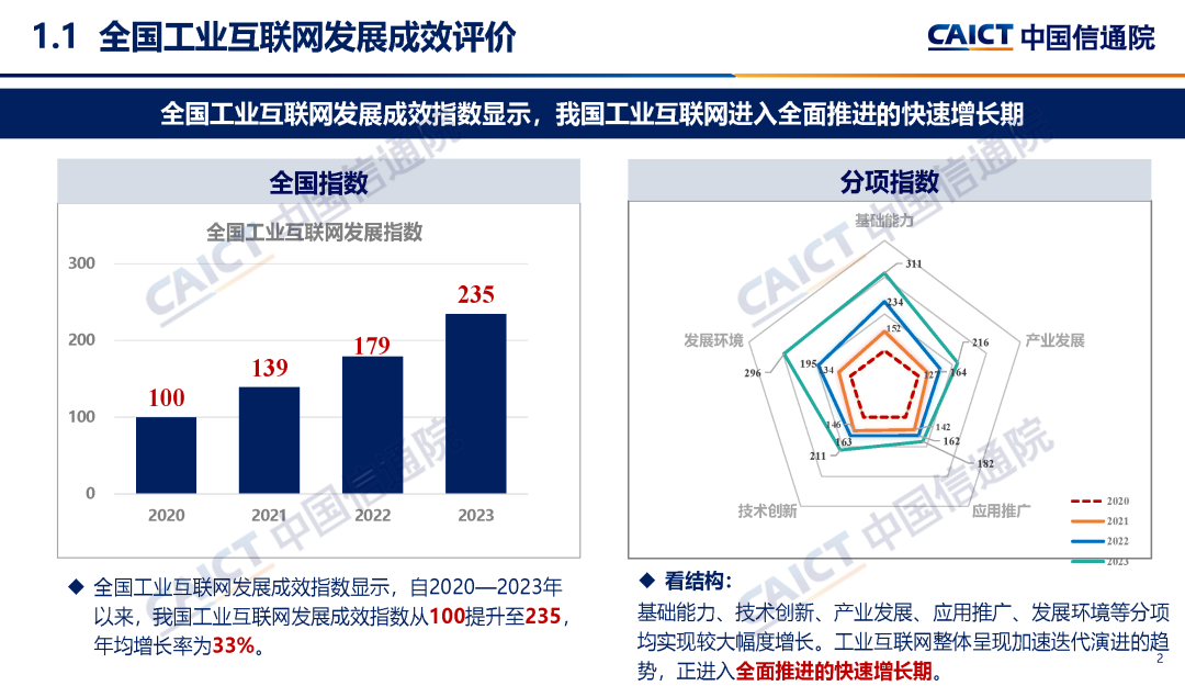 1. 全國工業互聯網發展成效指數顯示,我國工業互聯網進入全面推進的快速增長期。基礎能力指數連續三年高速增長,從“規模擴張”向“質量提升、結構優化、功能升級”轉變;技術創新指數穩步提升,新領域創新突破助力“換道超車”;產業發展指數增長提速,產業從舊到新、從小到大、從弱到強邁進;應用推廣指數穩定增長,由“全面探索”轉向“場景推廣、鏈式轉型”;發展環境指數增幅領先,政策、人才、資金等要素保障加速完善。