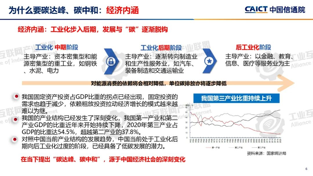 本期為您介紹由中國信息通信研究院泰爾終端實驗室副總工盧春陽分享的《碳達峰碳中和基礎知識和政策解讀》。盧春陽講解了碳達峰碳中和的科學內涵、經濟內涵和重要意義,分析了國內外能源消費結構和我國碳排放的現狀,以及碳達峰碳中和面臨的挑戰,解讀了我國碳達峰碳中和“1+N”政策體系,重點講解了《2030年前碳達峰行動方案》具體重點行動以及工業、建材和有色行業碳達峰實施方案的主要內容。