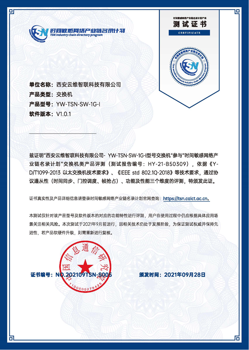 2021年9月,西安云維智聯(lián)科技有限公司研發(fā)的YW-TSN-SW-1G-I TSN交換機在互聯(lián)網(wǎng)與工業(yè)融合創(chuàng)新工信部重點實驗室順利通過“TSN產(chǎn)業(yè)鏈名錄計劃”產(chǎn)品測試,獲得交換機類測試證書,成為第一批加入產(chǎn)業(yè)鏈名錄計劃的產(chǎn)品。