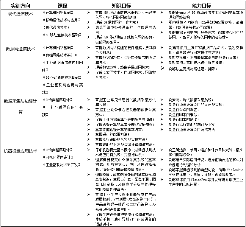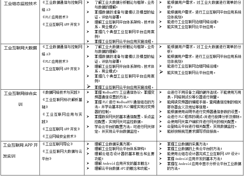 1、校內(nèi)低年級學生專業(yè)化培養(yǎng)根據(jù)“工業(yè)互聯(lián)網(wǎng)技術(shù)”專業(yè)人才培養(yǎng)方案,以專業(yè)基礎(chǔ)知識、技術(shù)、技能為主,培養(yǎng)具有扎實基礎(chǔ)與素養(yǎng)的專業(yè)人才。2、校內(nèi)高年級學生定向化培養(yǎng)根據(jù)當前及預期就業(yè)需求,以熱門就業(yè)崗位所需技能為主,培訓學生入職即上崗的專業(yè)技能。3、企業(yè)員工訂單式培養(yǎng)針對工業(yè)互聯(lián)網(wǎng)相關(guān)企業(yè)自有部分員工對本專業(yè)領(lǐng)域或?qū)I(yè)技術(shù)的不完全掌握,由企業(yè)自行提出需要培訓的內(nèi)容,承接其培訓工作。4、社會人員項目制培養(yǎng)針對無法由企業(yè)出面組織、或本人有意愿進入工業(yè)互聯(lián)網(wǎng)領(lǐng)域的散裝社會人員,制定適合不同層次、不同崗位的實訓項目,吸引其參加培訓。5、國際化人才培養(yǎng)針對本校外籍留學生,以專業(yè)基礎(chǔ)知識與技能為主,結(jié)合其所在國家工業(yè)互聯(lián)網(wǎng)發(fā)展水平,設計實訓項目。6、“1+X”技能證書培訓與認證針對具有拿證需求的人員,根據(jù)技能證書要求,進行培訓及考核。7、線上培訓課程輻射其他地區(qū)整合蘇州本地的工業(yè)互聯(lián)網(wǎng)產(chǎn)業(yè)發(fā)展的經(jīng)驗和技術(shù)積累,將其中具有代表性的內(nèi)容做成培訓內(nèi)容,通過線上課程,傳播到其他城市和地區(qū),為工業(yè)互聯(lián)網(wǎng)技術(shù)的全面發(fā)展和普及做貢獻。