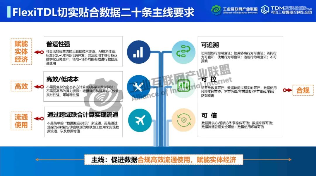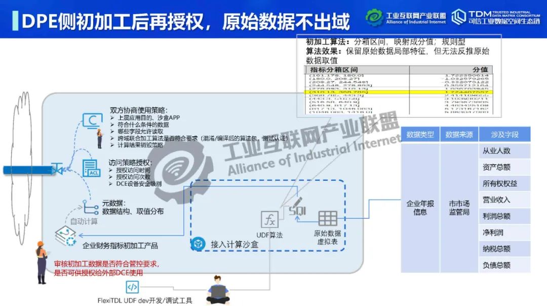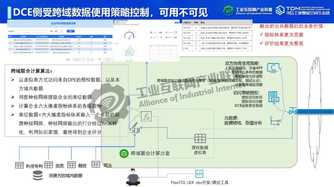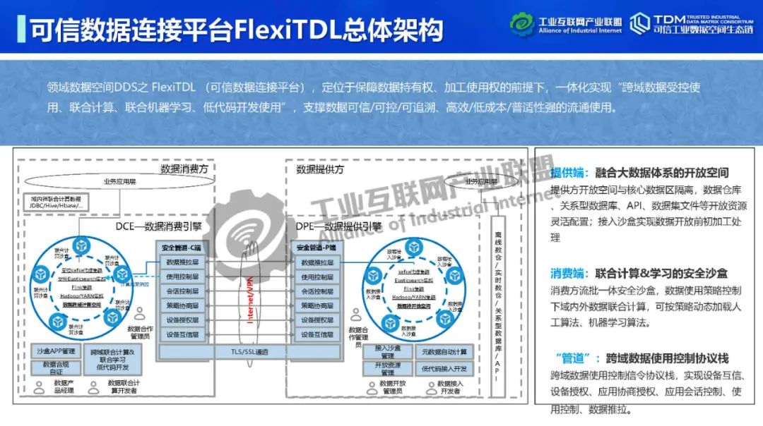 在本次講座中,深圳數(shù)鑫科技有限公司創(chuàng)始人&CEO吳會才詳細介紹了可信數(shù)據(jù)空間跨域使用控制技術。他指出,可信數(shù)據(jù)空間的跨域使用控制功能可實現(xiàn)數(shù)據(jù)“用后即焚”,保障數(shù)據(jù)持有權,實現(xiàn)數(shù)據(jù)在跨主體流通中持有權與加工使用權分離。吳會才以可信數(shù)據(jù)連接平臺FlexiTDL實例介紹了跨域使用控制的實現(xiàn)方式。可信數(shù)據(jù)連接平臺由DPE(數(shù)據(jù)提供引擎)和DCE(數(shù)據(jù)消費引擎)通過TLS/SSL安全通道連接組成。數(shù)據(jù)提供和使用雙方在數(shù)據(jù)流通前確定數(shù)據(jù)使用策略,即如何使用數(shù)據(jù)。DPE采用數(shù)據(jù)沙盒模式,將提供方開放空間與核心數(shù)據(jù)區(qū)隔離,為數(shù)據(jù)倉庫、關系型數(shù)據(jù)庫、API、數(shù)據(jù)集文件等開放數(shù)據(jù)資源提供靈活的接入,可在數(shù)據(jù)沙盒中實現(xiàn)數(shù)據(jù)開放前初加工處理,如數(shù)據(jù)脫敏。DCE為消費方提供流批一體安全沙盒,在數(shù)據(jù)使用策略控制下進行域內(nèi)外數(shù)據(jù)聯(lián)合計算,在使用策略管控下動態(tài)加載人工算法、機器學習算法。DCE在數(shù)據(jù)按使用策略完成使用后,將原始數(shù)據(jù)刪除,實現(xiàn)跨域使用控制,即“用后即焚”。