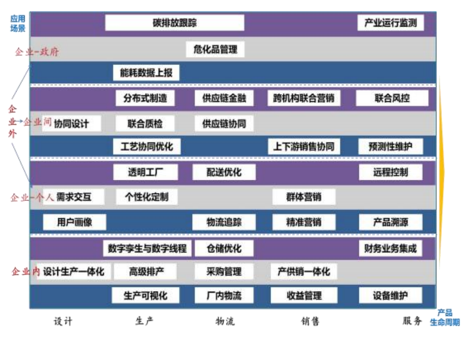 各場景通過數據空間縱向打通個人、企業內外、政府間數據可信流通、匯聚及協同,橫向貫穿設計、生產、物流、銷售、服務整個產品全生命周期中多業務、多領域環節,開展應用改造和創新,形成具有工業數據可信流通的三大層級,包含產品數字化交付、生產集中管控、供應鏈協同優化、設備資產全生命周期管理等主要場景,推動企業實現業務流程和商業模式的改造或重構,帶動企業實施轉型升級,實現降本提質增效減存,并不斷催生新的增長點。具體工業數據流通場景情況見圖1。