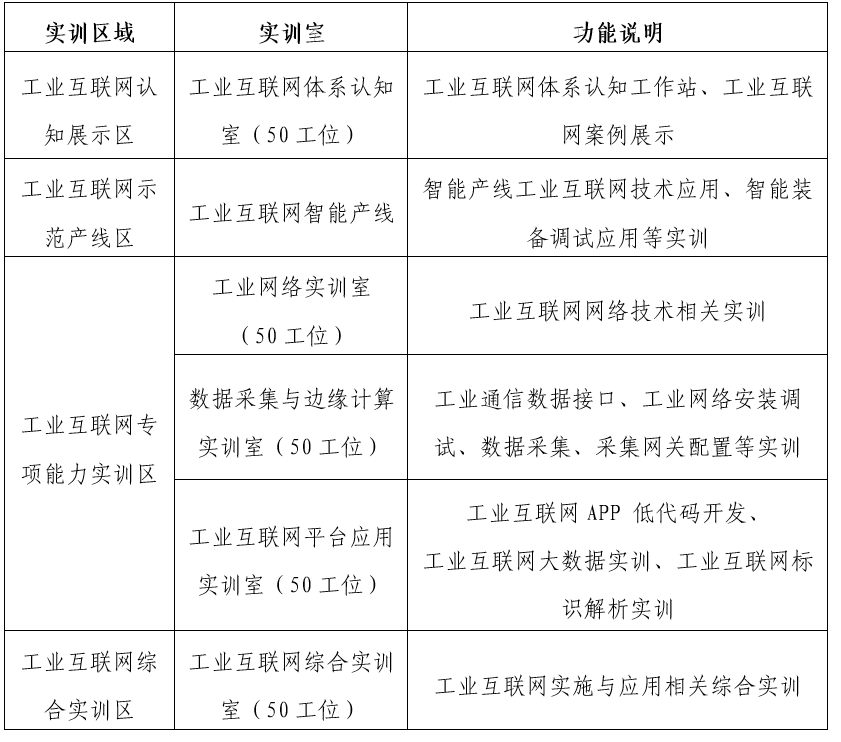 工業(yè)互聯(lián)網(wǎng)專項能力實訓(xùn)區(qū)域:工業(yè)互聯(lián)網(wǎng)專項能力實訓(xùn)區(qū)將規(guī)劃有工業(yè)網(wǎng)絡(luò)實訓(xùn)室、數(shù)據(jù)采集與邊緣計算實訓(xùn)室和工業(yè)互聯(lián)網(wǎng)平臺應(yīng)用實訓(xùn)室等實訓(xùn)環(huán)境,基于技術(shù)領(lǐng)域視角,覆蓋了工業(yè)互聯(lián)網(wǎng)技術(shù)領(lǐng)域的感知控制層、網(wǎng)絡(luò)層、平臺層、應(yīng)用層的實訓(xùn)教學(xué),能夠讓學(xué)生基本掌握工業(yè)互聯(lián)網(wǎng)平臺實施部署、運營維護、技術(shù)應(yīng)用等專項技術(shù)應(yīng)用能力。