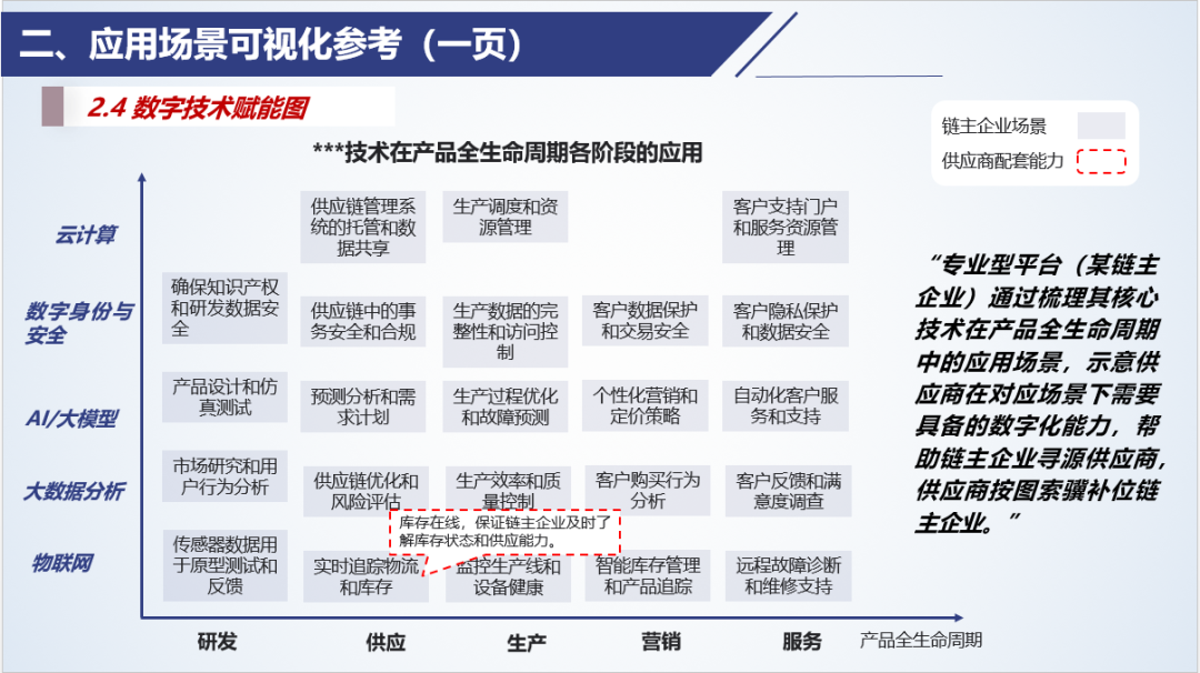 數(shù)智化供應(yīng)鏈管理。通過應(yīng)用場景地圖,包括業(yè)務(wù)場景和數(shù)智化賦能場景,企業(yè)可以更好地理解和優(yōu)化其供應(yīng)鏈,確保高效和響應(yīng)靈敏。