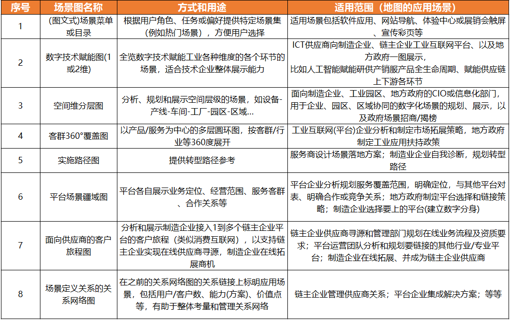 應(yīng)用場景地圖適用于產(chǎn)業(yè)鏈圖譜不能覆蓋的細(xì)分場景,特別是在創(chuàng)新和技術(shù)應(yīng)用方面;尤其適用于平臺(tái)明確定位、實(shí)現(xiàn)差異化競爭、以及平臺(tái)間互聯(lián)互通和合作。具體形式包括:技術(shù)賦能制造或供應(yīng)鏈的二維圖、從設(shè)備/產(chǎn)線到全國布局的空間維分層圖、展示服務(wù)范圍和能力邊界的平臺(tái)場景疆域圖、描繪制造企業(yè)成為鏈主企業(yè)的供應(yīng)商的客戶旅程圖、等等。應(yīng)用場景地圖的特點(diǎn)和優(yōu)點(diǎn)在于可提供全景式展示,可針對(duì)特定客戶群體的需求定制化,可靈活適用于各類應(yīng)用領(lǐng)域,可根據(jù)市場和技術(shù)變化進(jìn)行迭代更新。