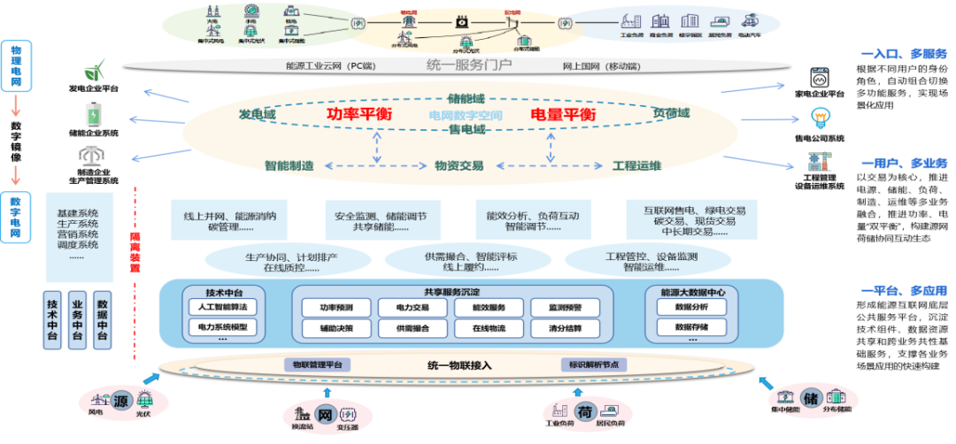 下一層是電力運(yùn)營的發(fā)電、儲(chǔ)能、負(fù)荷、售電域四大領(lǐng)域間的協(xié)同工作,確保電力系統(tǒng)的平衡和高效運(yùn)行。并給出電力供應(yīng)鏈支撐場景,通過智能制造、物資交易、工程運(yùn)維等實(shí)現(xiàn)供應(yīng)鏈的高效管理和優(yōu)化。再給出平臺(tái)支撐的線上業(yè)務(wù)場景,電力能源供應(yīng)鏈和電力運(yùn)營的細(xì)化線上場景,通過技術(shù)和服務(wù)平臺(tái)實(shí)現(xiàn)更高效、靈活和智能的電力管理。最下層是物理實(shí)體世界的數(shù)字化:按源、網(wǎng)、荷、儲(chǔ)電力運(yùn)營四大領(lǐng)域數(shù)字化,而不是堆砌設(shè)備。