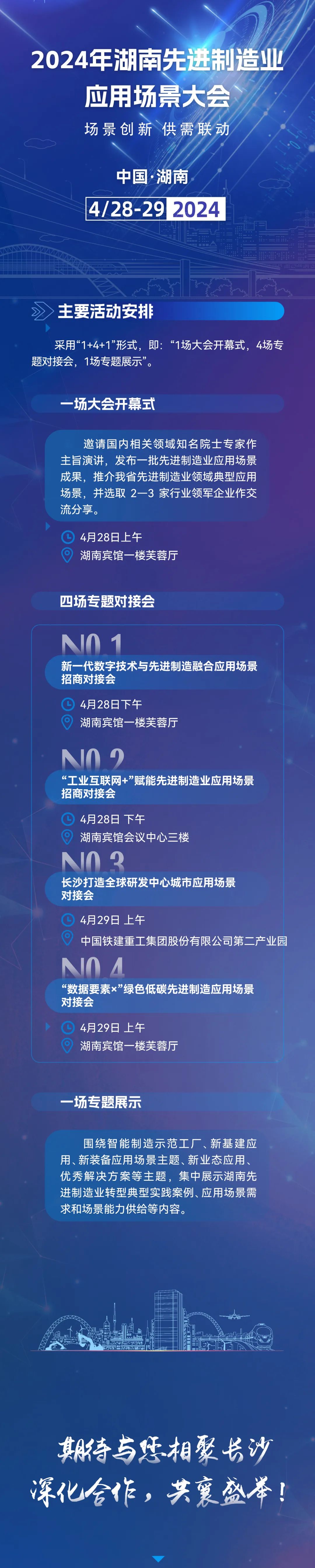 4月28日-29日,由湖南省商務(wù)廳、省發(fā)展改革委、省科技廳、省工業(yè)和信息化廳、省國資委、省數(shù)據(jù)局、長沙市人民政府共同主辦的2024年湖南先進制造業(yè)應(yīng)用場景大會將于湖南長沙舉行。