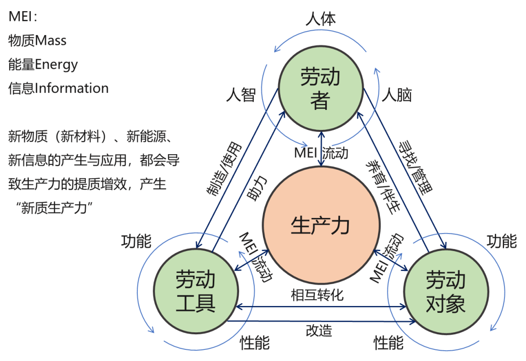 由圖2,在勞動者、勞動工具、勞動對象三要素之間,一直彼此流動著物質(zhì)、能量和信息(MEI),三要素之間彼此相互作用,甚至相互轉(zhuǎn)化(如:勞動工具?勞動對象),MEI之間其實也是相互作用、彼此轉(zhuǎn)化的。三要素+MEI所體現(xiàn)出來的相互作用與彼此轉(zhuǎn)化,帶來了勞動者、勞動工具和勞動對象的持續(xù)變革和升級,導致對MEI的更為有效的利用和相互轉(zhuǎn)化,讓生產(chǎn)力的實現(xiàn)載體、表現(xiàn)形式、利用效率、內(nèi)涵外延都發(fā)生了巨大變革,甚至是顛覆性創(chuàng)新,由此而迸發(fā)出相對于原有生產(chǎn)力的“新質(zhì)生產(chǎn)力”。這應該是對新質(zhì)生產(chǎn)力產(chǎn)生機理的一種探索和解讀。