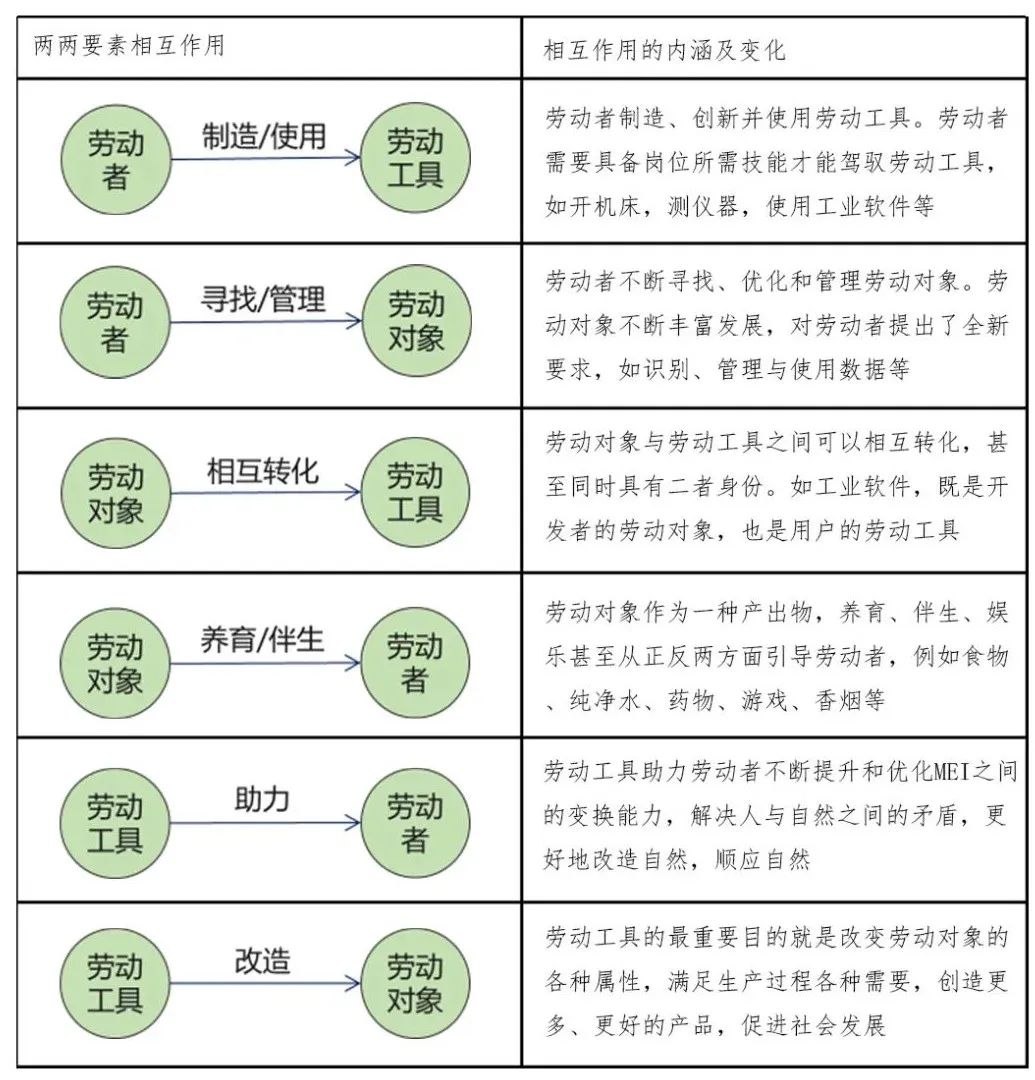 由圖2生產(chǎn)力三要素新模型看到,三要素之間的各個要素是彼此兩兩相互作用的。相互作用的結(jié)果及其內(nèi)涵變化,如表1所示。