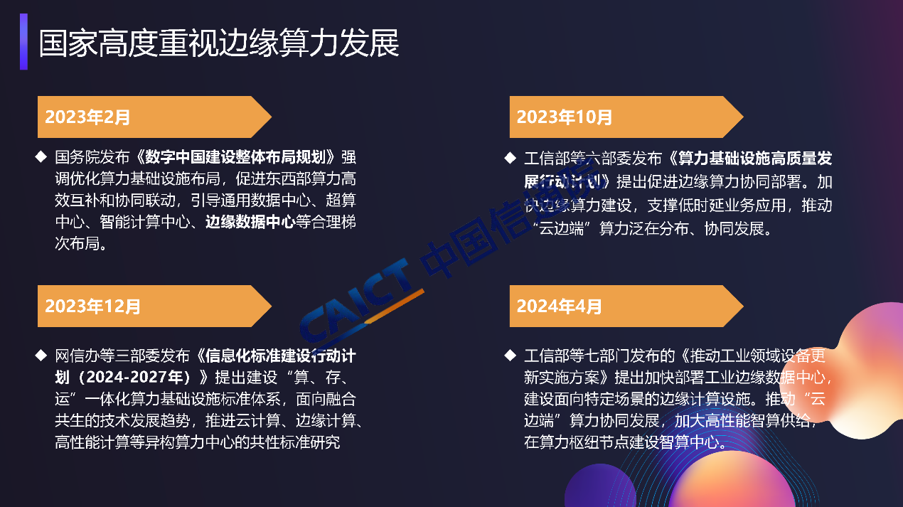 工信部等六部委聯合發布《算力基礎設施高質量發展行動計劃》,明確提出促進邊緣算力協同部署,加快邊緣算力建設,支撐工業制造、金融交易、智能電網、云游戲等低時延業務應用,推動“云邊端”算力泛在分布、協同發展。中國鐵塔、中國信通院、中國聯通、中國移動等單位共同啟動邊緣算力研究項目,并形成了《邊緣算力藍皮書》,也期待與行業內合作伙伴共同合作,持續推動邊緣算力技術體系構建及產業生態發展。
