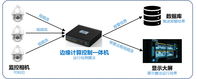 生產車間場景復雜多變,其中存在一些常見的車間人員不安全行為,如登梯未扶梯、未佩戴安全帽、未正確穿戴工服、作業場所吸煙以及作業中看手機等,這些行為極有可能引起重大安全事故。東方研究院針對以上實際生產場景中可能存在的安全風險行為,基于EC13211研發了生產車間不安全行為智能識別系統,控制器分布式布置于車間多個位置,就近進行攝像頭的視頻采集和AI處理,支持同時檢測多路視頻流、多種智能算法,高效利用硬件資源,同時降低車間帶寬壓力,實現廣域車間全覆蓋。該系統能夠實時發現、展示并上傳不安全行為報警信息,通過短信提醒指定安全員進行處理,有效降低了車間中可能存在的相關安全風險。