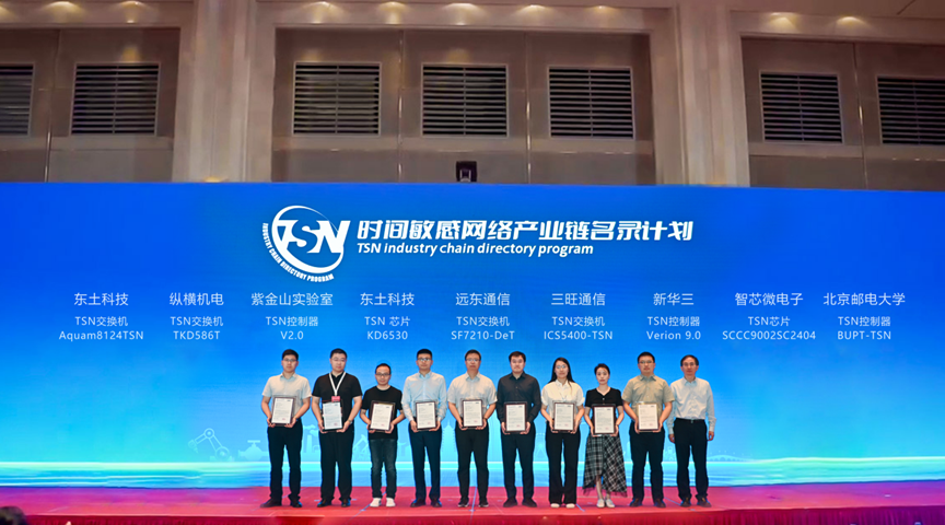 2023年6月16日上午,在蘇州舉辦的“2023工業(yè)互聯(lián)網(wǎng)大會-工業(yè)互聯(lián)網(wǎng)網(wǎng)絡(luò)創(chuàng)新發(fā)展論壇”上,中國信息通信研究院院長、工業(yè)互聯(lián)網(wǎng)產(chǎn)業(yè)聯(lián)盟理事長余曉暉發(fā)布了“TSN產(chǎn)業(yè)鏈名錄計(jì)劃”第二批評測通過的芯片、控制器、交換機(jī)等產(chǎn)品名單,并為北京東土科技股份有限公司、北京縱橫機(jī)電科技有限公司、紫金山實(shí)驗(yàn)室、河北遠(yuǎn)東通信系統(tǒng)工程有限公司、深圳市三旺通信股份有限公司、新華三技術(shù)有限公司、北京智芯微電子科技有限公司、北京郵電大學(xué)等8家名錄企業(yè)代表頒發(fā)了證書。
