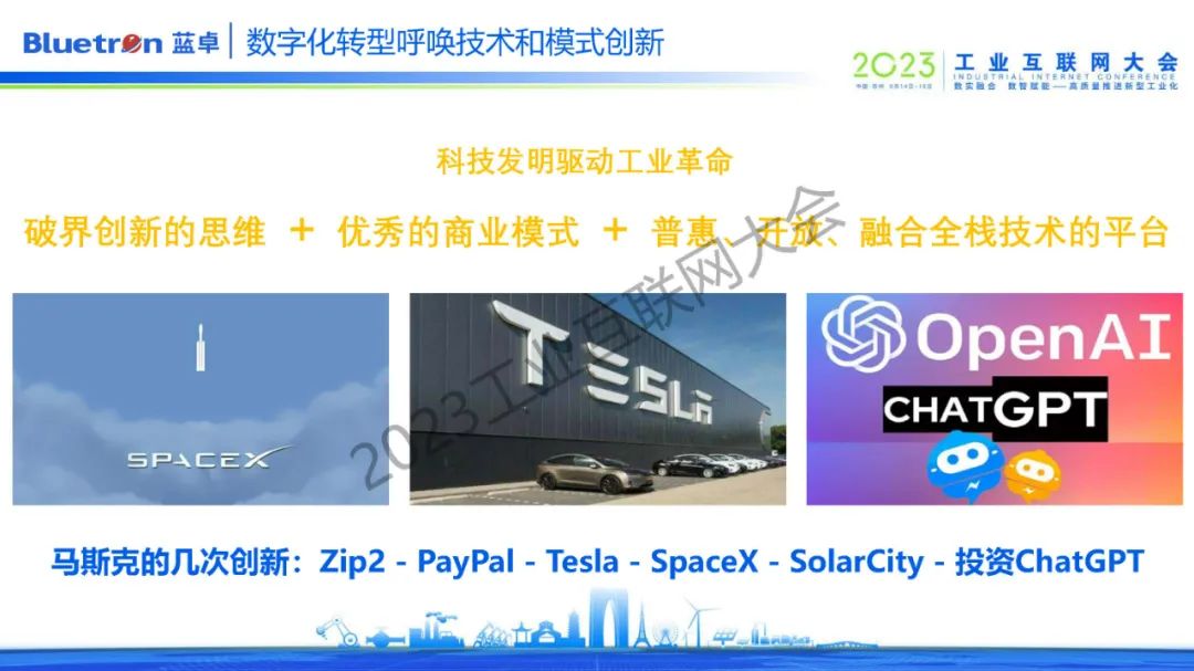 從電氣化到自動化到智能化,趙偉總結了工業革命的兩個主要規律,第一是由科技發明驅動的工業革命,比如作為通用技術的科技發明推向市場讓更多的場景和客戶使用。第二是則由創新模式驅動的工業革命,例如馬斯克的幾次創新,PayPal、特斯拉、SpaceX、以及近期投資ChatGPT等,該模式需要我們擁有破界創新的思維,優秀的商業模式,普惠、開放、融合全棧技術的平臺。