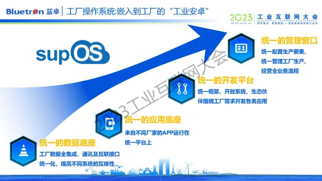第一,打造行業標桿。藍卓暢想的未來工廠是基于supOS工業操作系統實現生產制造自動化和經營管理自動化的貫通,以此解決工業企業數據的問題,技術使用的問題。
