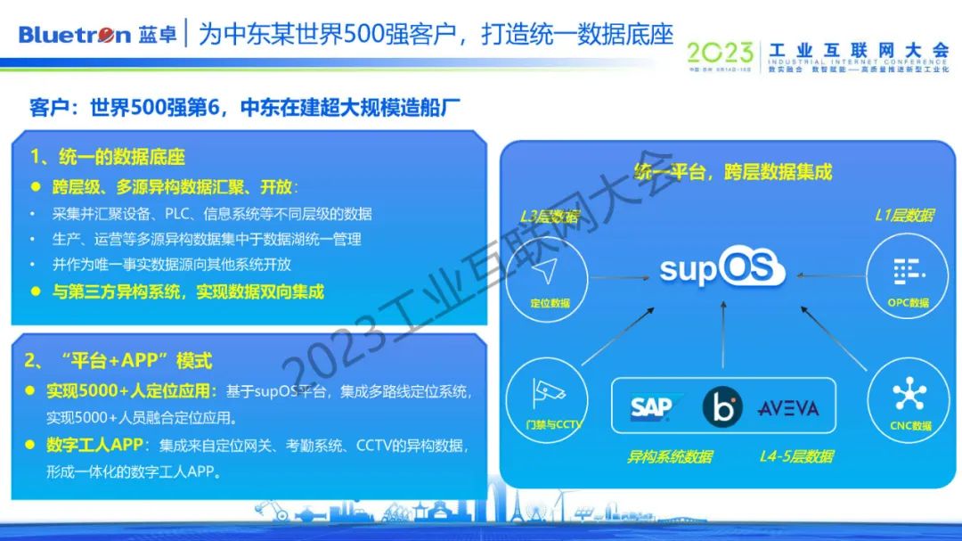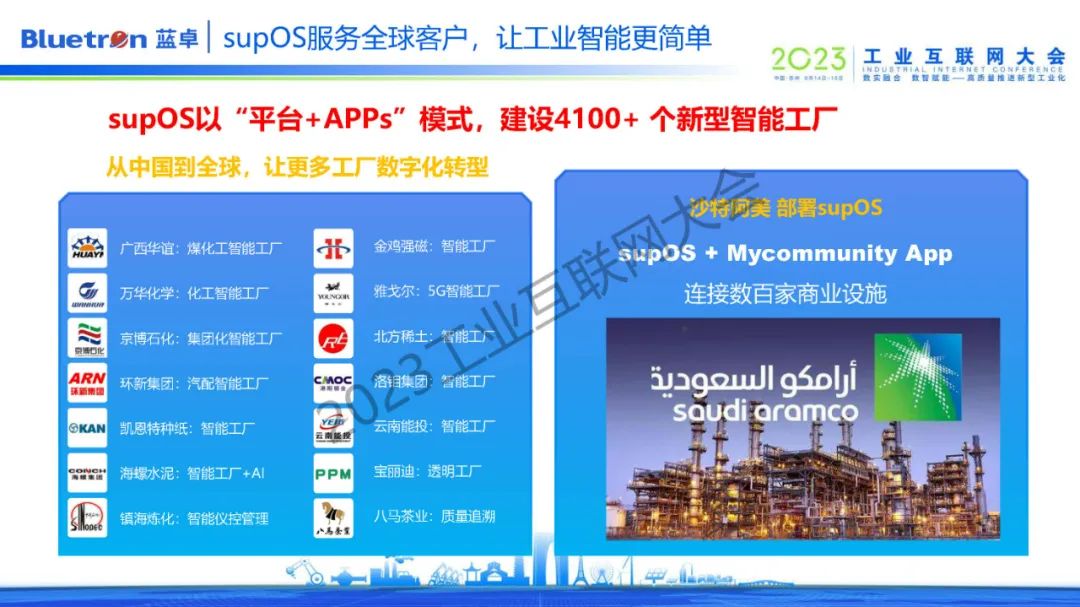 趙偉表示,目前藍卓已經實現了4100+新型智能工廠的實踐,覆蓋了30個行業,在世界五百強企業、“數字領航”工廠以及“未來工廠”中得到廣泛應用,并介紹了幾個典型的supOS賦能案例。