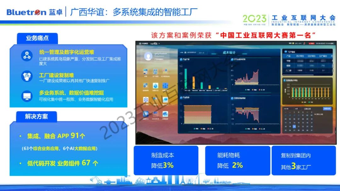 廣西華誼則是典型的多系統集成智能工廠,已建系統孤島現象嚴重,分發到二級工廠集成難度大,依托supOS工業操作系統集成融合了APP91個,便于統一運維管理。低代碼開發和業務組件67個,滿足個性化應用的需求。通過數據挖掘、協同優化、智能化管理、數據化運營,實現制造成本降低3%,能耗物耗降低2%。該方案也獲得了中國工業互聯網大賽第一名。