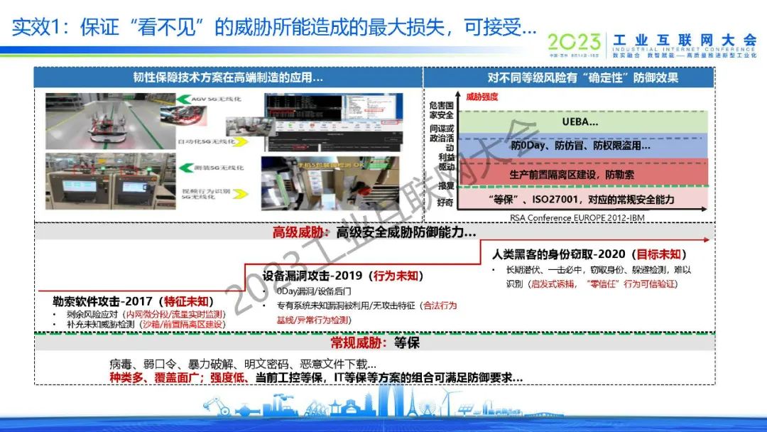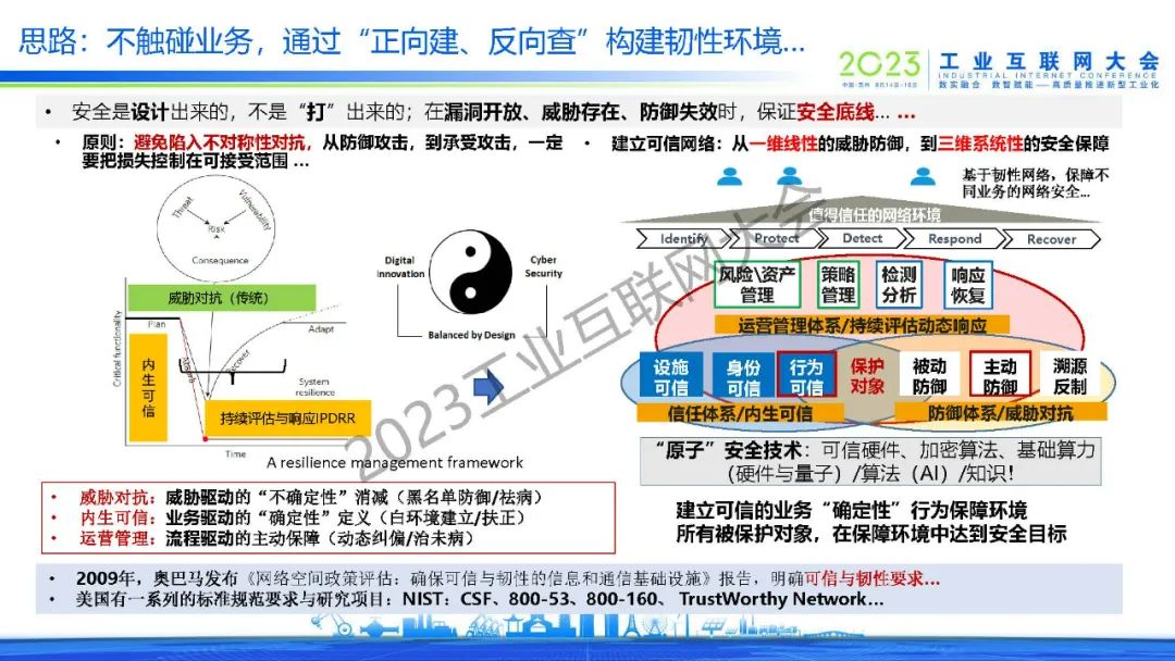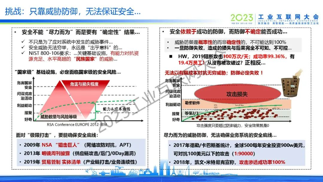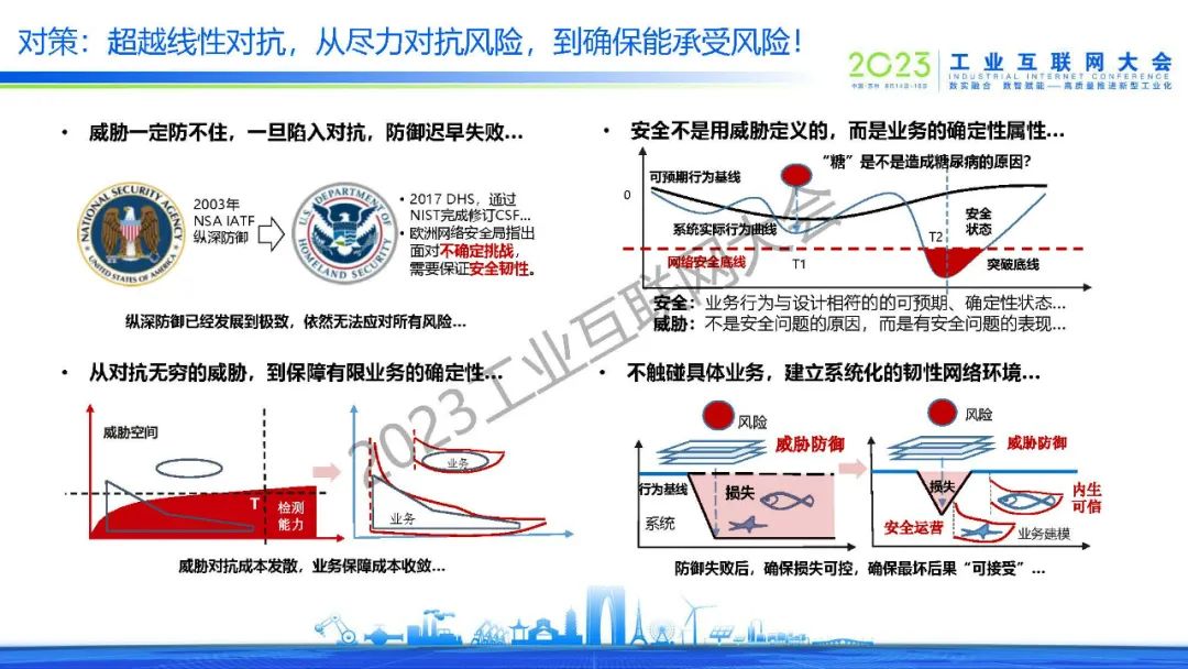 王雨晨指出,安全是產業(yè)數(shù)字化轉型中的“馬六甲海峽”,越有價值的系統(tǒng),面臨的安全風險越大。對抗策略也需要超越線性對抗,從盡力對抗風險,到確保能承受風險。建立可信網絡:從一維線性的威脅防御,到三維系統(tǒng)性的安全保障,前置隔離區(qū)爭取最好情況,內網微隔離確保最壞結果可接受,運營管理區(qū)實現(xiàn)動態(tài)安全。