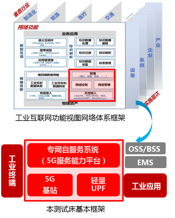 本測試床在工業互聯網功能視圖網絡體系框架中的位置如下圖所示,通過無線接入、網絡控制實現5G虛擬專網,通過網絡管理、管理實現企業對專網的自主管理、自主開戶開卡。