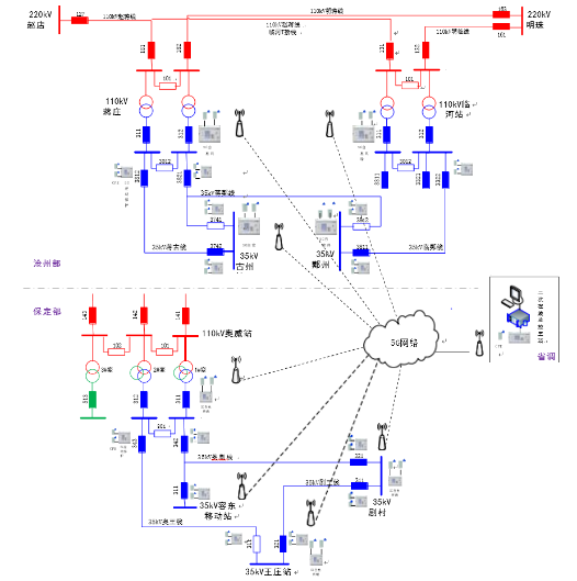 保定部分工程基于5G通信既實現(xiàn)上下級備自投(110kV奧威站的站域備自投與35kV劇村站和35kV王莊站的區(qū)域備自投)動作時間的優(yōu)化配合關(guān)系,又實現(xiàn)了35kV劇村站和35kV王莊站之間的區(qū)域備自投。