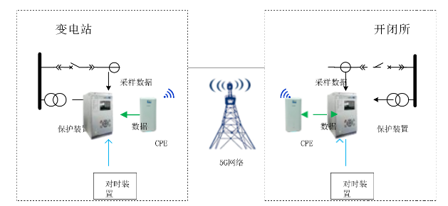 光纖差動保護采用專用光纖或復(fù)用2M光纖通道,路由相同且收發(fā)延時一致,采用乒乓法原理進行數(shù)據(jù)同步,不依賴外部時鐘同步。而5G差動保護采用5G網(wǎng)絡(luò),通道延遲抖動較大,傳輸延時不固定,上下行通道延時不一致,需要采用類似變電站內(nèi)組網(wǎng)SV采用的基于對時同步下的數(shù)據(jù)傳輸和采樣插值同步方案。當(dāng)前階段,5G無線終端CPE不支持對時輸出,只能采用外部時鐘同步,通過外部授時系統(tǒng)(北斗和GPS授時)實現(xiàn)數(shù)據(jù)同步,配置如圖5-1所示。