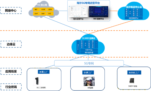 5G邊緣計算、網絡切片構建網絡基礎,支撐人工智能等新技術在工業領域的應用和落地。同時形成5G全鏈接工廠的建設標準,指導與規范示范項目的推廣與應用。該測試床運用5G、網絡切片、MEC邊緣計算構建可視化運維的5G虛擬專網,依托COSMOPlat和邊緣計算平臺優勢和最新5G終端,測試5G各性能在海爾工廠多場景的驗證。