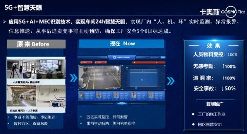 智慧天眼:以5G+AI深度學習、MEC邊緣云計算技術為依托,基于現有視頻流,實現廠內“人、機、環”實時監測、異常報警、信息推送,從事后追責變事前主動預防,確保工廠安全5個0目標達成。