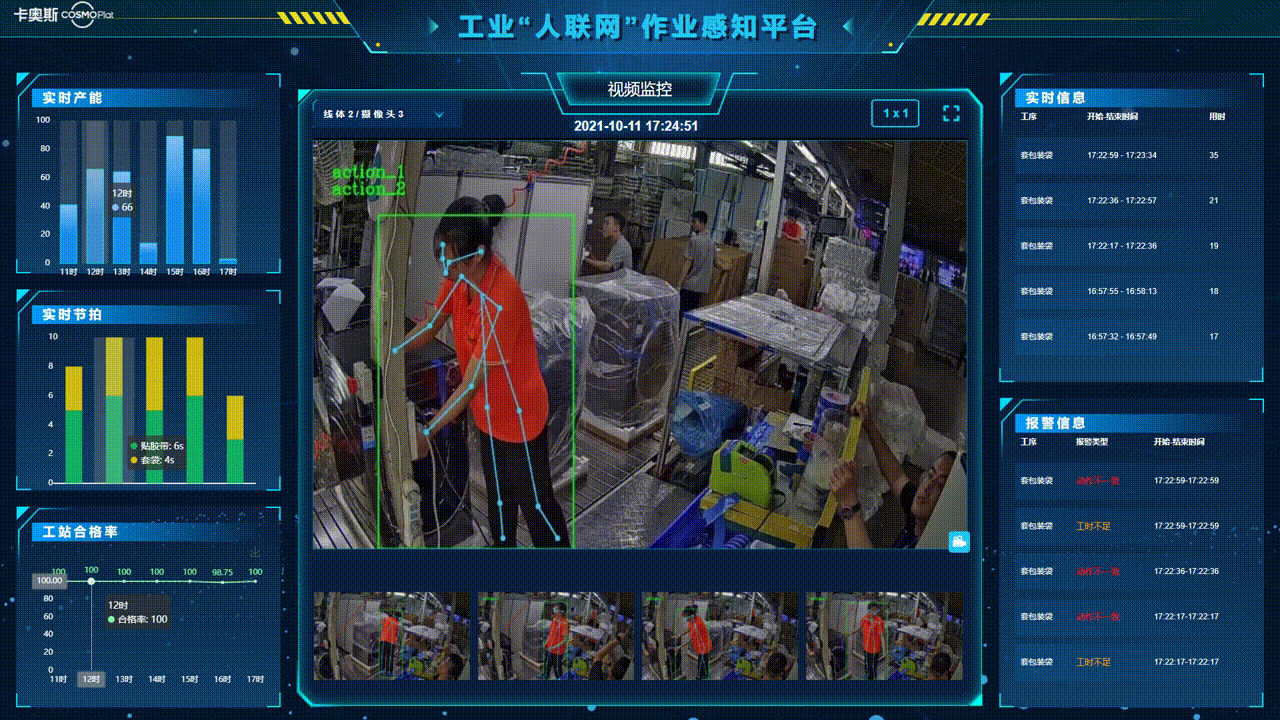 作業感知:以生產崗位人員的操作動作切入,解決因操作動作出現問題導致的質量事故,同時對節拍、工步、軌跡有分析能力,對工人工作流程步驟進行解析,分析無效動作及有效動作,不斷優化生產步驟,優化改良生產作業規范過程,有效提升了工人工作效率的同時降低了工人的工作量。