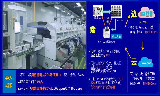 通過5G+AI構(gòu)建機(jī)器視覺智能檢測(cè),解決單機(jī)運(yùn)算資源不足與云端計(jì)算網(wǎng)絡(luò)延時(shí)問題,實(shí)現(xiàn)端邊云協(xié)同毫秒級(jí)響應(yīng)處理,提升檢測(cè)效率與品質(zhì),單日產(chǎn)出可增加24,000片,復(fù)判人力節(jié)省96人,不良漏失減少80%。