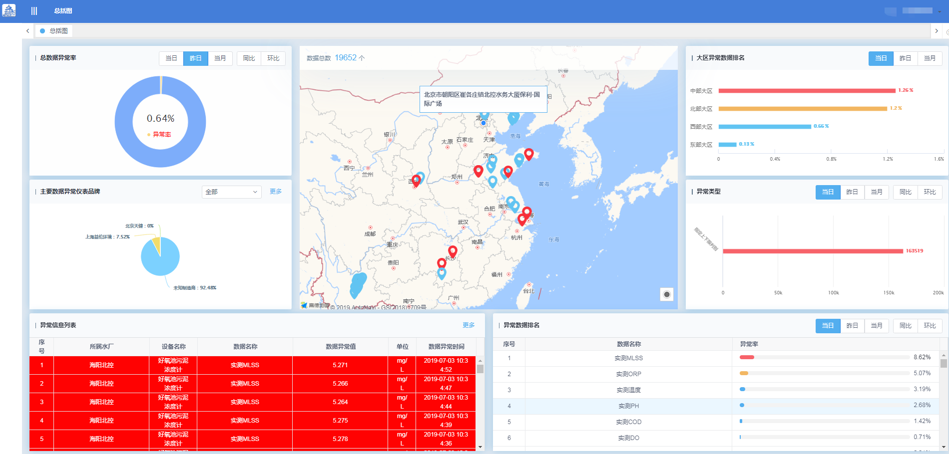 判別異常的數據通圖形化方式展示,通過對異常數據的統計分析,延長設備和儀表使用壽命,降低設備維護成本,擇優選擇更可靠的品牌產品。在地圖上看到所有污水廠分布以及在線情況,多維度對異常數據進行統計,全方位剖析數據異常統計情況。