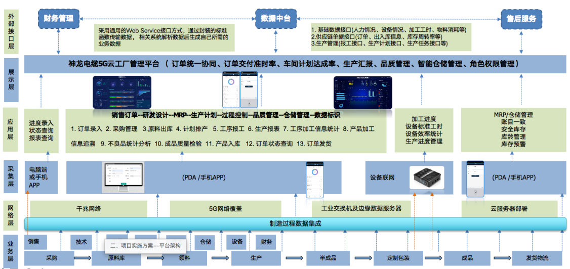 神龍電纜5G云工廠項目整體規(guī)劃以底層的工業(yè)級網(wǎng)絡(luò)搭建與設(shè)備數(shù)采技術(shù)為支撐,以各生產(chǎn)要素集成的數(shù)字化工位搭建為系統(tǒng)核心,車間級綜合數(shù)字化管理平臺為數(shù)據(jù)應(yīng)用載體,建設(shè)電纜制造行業(yè)標桿,帶動行業(yè)集群轉(zhuǎn)型升級,建立行業(yè)智造標準,推動行業(yè)發(fā)展。主要分為以下幾個方面: