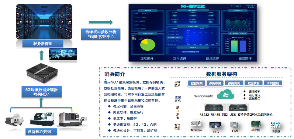 應(yīng)用5G網(wǎng)絡(luò)將設(shè)備聯(lián)網(wǎng),通過5G邊緣數(shù)據(jù)處理器哨兵NO.1對設(shè)備進行加工參數(shù)、設(shè)備狀態(tài)等實時數(shù)據(jù)的采集,可實現(xiàn)對不同行業(yè)工業(yè)現(xiàn)場的智能設(shè)備進行集中數(shù)據(jù)采集和監(jiān)控管理。另一方面基于5G邊緣數(shù)據(jù)處理器哨兵NO.1的內(nèi)置高性能芯片與處理系統(tǒng),能夠?qū)?shù)據(jù)從邊緣側(cè)、傳輸?shù)皆贫耍瑢崿F(xiàn)數(shù)據(jù)的遠程接入。