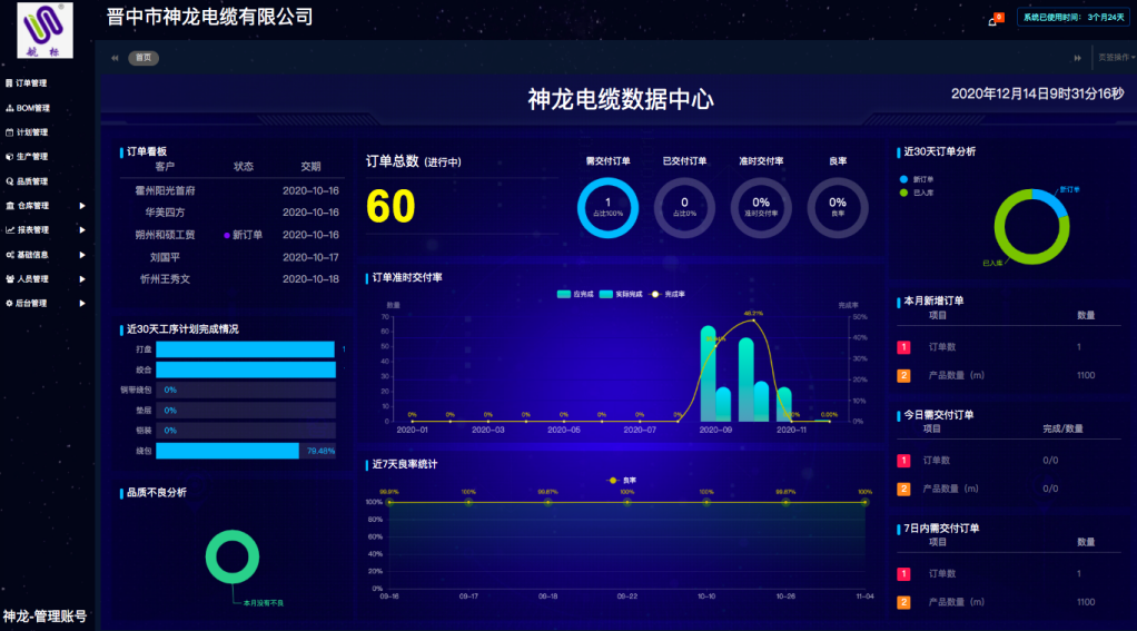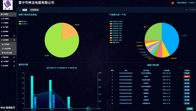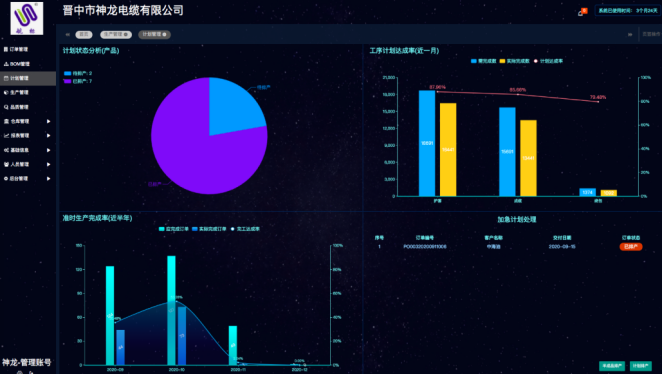 隨著神龍電纜企業(yè)規(guī)模的擴大,公司業(yè)務(wù)快速成長,訂單數(shù)量逐年成倍增長,靠原有的生產(chǎn)管理模式已無法滿足企業(yè)發(fā)展的需要。面臨的主要問題是訂單種類多,客戶下單頻度高,無法及時掌握訂單交付進度,產(chǎn)品生產(chǎn)周期長,內(nèi)部生產(chǎn)計劃組織混亂,生產(chǎn)協(xié)同性差,重點設(shè)備管理混亂,無法監(jiān)控設(shè)備生產(chǎn)狀態(tài),導(dǎo)致產(chǎn)能不足,資源整體利用率低,同時隨著電線電纜的定制化程度增加,生產(chǎn)與精密加工對企業(yè)的協(xié)同設(shè)計、協(xié)同生產(chǎn)、協(xié)同供應(yīng)鏈提出了更高的要求,大量的技術(shù)工藝、原料檢測、生產(chǎn)協(xié)同、生產(chǎn)加工數(shù)據(jù)需要記錄、分析、反饋、決策。