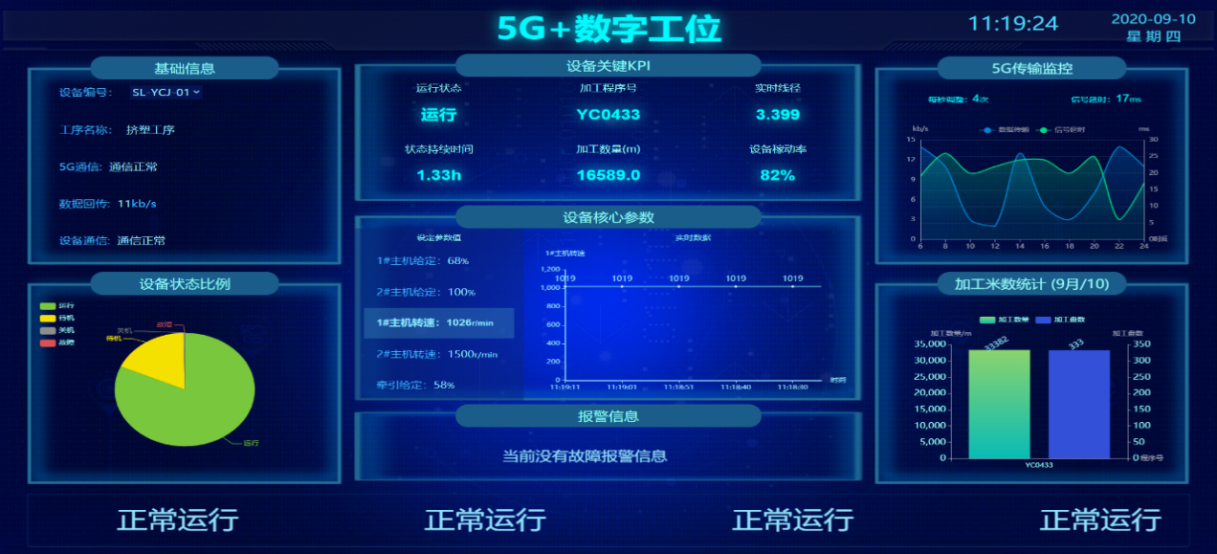 基于神龍電纜5G云工廠管理平臺,建立由業(yè)務(wù)接單-研發(fā)設(shè)計-MRP-生產(chǎn)計劃-過程控制-品質(zhì)管理-倉儲管理-物流發(fā)運的完整管理協(xié)同平臺;應(yīng)用5G技術(shù)實現(xiàn)車間內(nèi)部網(wǎng)絡(luò)重建;利用5G靈敏度傳輸,實現(xiàn)設(shè)備核心參數(shù)波動的及時反饋,利用5G低延時技術(shù)實現(xiàn)數(shù)據(jù)與服務(wù)器的快速調(diào)取,并將波動數(shù)據(jù)快速調(diào)整到標準值域,提高設(shè)備穩(wěn)定性。同時建設(shè)了邊緣數(shù)據(jù)處理中心,為日后設(shè)備接入預(yù)留了充足數(shù)據(jù)接口。