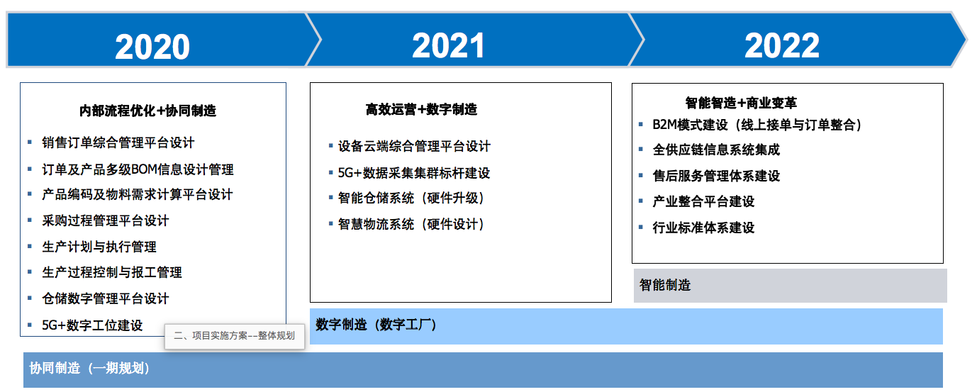 三期(2022)是實現(xiàn)智能化管理和產(chǎn)業(yè)整合平臺建設(shè),最終實現(xiàn)智能制造的目標。