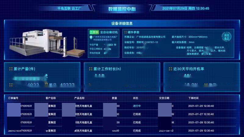本項目充分利用根云平臺的物聯(lián)接入以及數(shù)據(jù)計算等能力,將印刷包裝設(shè)備連接呈現(xiàn),實現(xiàn)設(shè)備監(jiān)控、訂單監(jiān)控等功能,為千鳥四大業(yè)務(wù)提供數(shù)據(jù)支撐。