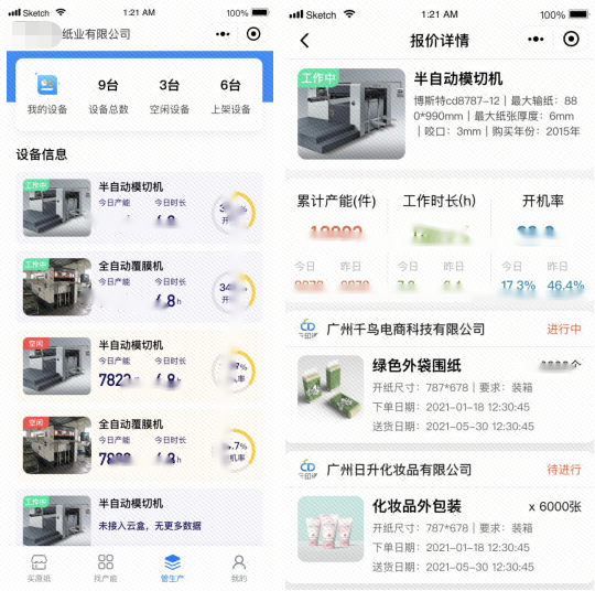 第一,訂單拆分。以具體訂單為例,為提高生產(chǎn)效率,縮短生產(chǎn)鏈條,對訂單按照最小顆粒度進(jìn)行拆解。比方說美思天地蓋的包裝,共需要6個工藝,我們會將其拆成印刷、啞膜、開槽、裱、內(nèi)托、粘合等6個工藝,然后通過不同的協(xié)同工廠,一般是2-3家。之后再將生產(chǎn)設(shè)備連接至線上平臺,進(jìn)行統(tǒng)一調(diào)度,組成新的生產(chǎn)線,按照先前確定好的價格開展生產(chǎn),從而提高企業(yè)對于閑置產(chǎn)能利用的同時,降低生產(chǎn)成本,在價格上形成競爭優(yōu)勢。