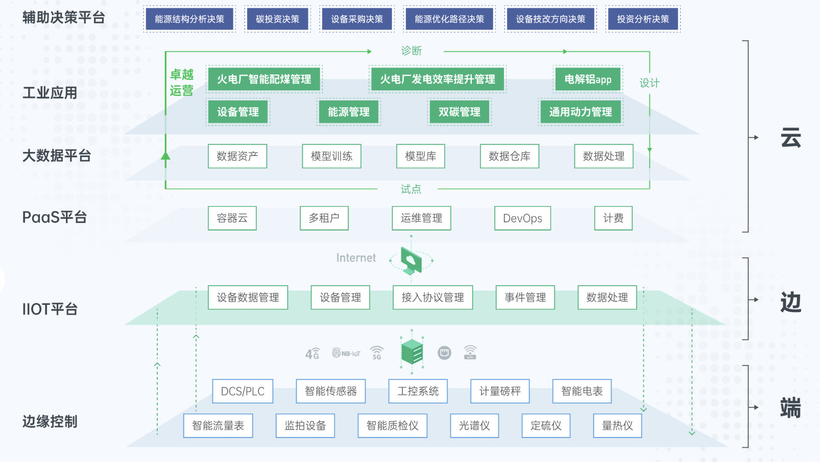 本項目總體框架可概括為“1個工業互聯網數字化底座+7個工業應用+1套卓越運營轉型方法論”。廣域銘島為百礦集團搭建起一個工業互聯網平臺,并以平臺為基礎實現企業設備及能源上云,在產業鏈數據可視的前提下,在火力發電、電解鋁、通用動力等方面研發各類能源優化算法模型,并形成若干工業應用,提供智能決策優化路徑,降低對工藝專家知識的依賴,提供“專家賦能,數據驅動”為特征的工廠綠色低碳解決方案。如下圖所示: