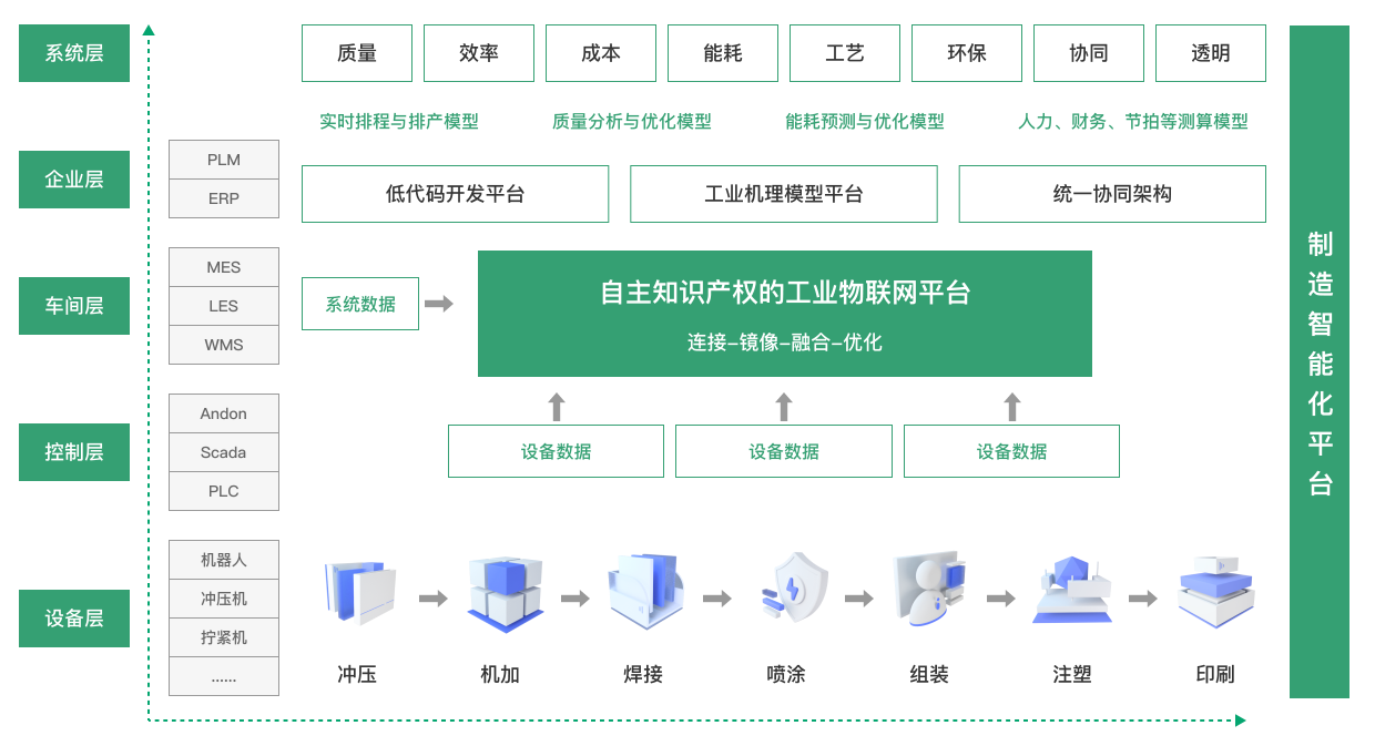 通過IIOT平臺自動采集各系統、設備的能耗、碳排數據,并通過碳排放評估模型,對企業制造過程碳排放的識別、監測、核算、報告,實現企業碳資產管理。同時提供“專家賦能、數據驅動”的方案,從運營、工藝、能耗、技術等全鏈路優化碳排放,挖掘工廠節能空間實現企業精準降碳、智能降碳,助力企業實現綠色可持續發展。