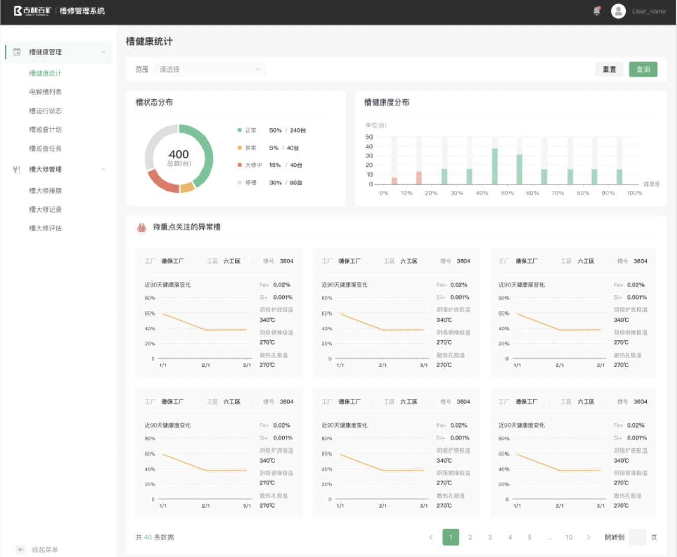 槽修管理:基于IIOT平臺采集槽狀態歷史數據,在工廠、工區、單槽的維度對槽狀態進行分析和預測,持續跟蹤模擬槽狀態,提前對異常進行預警。