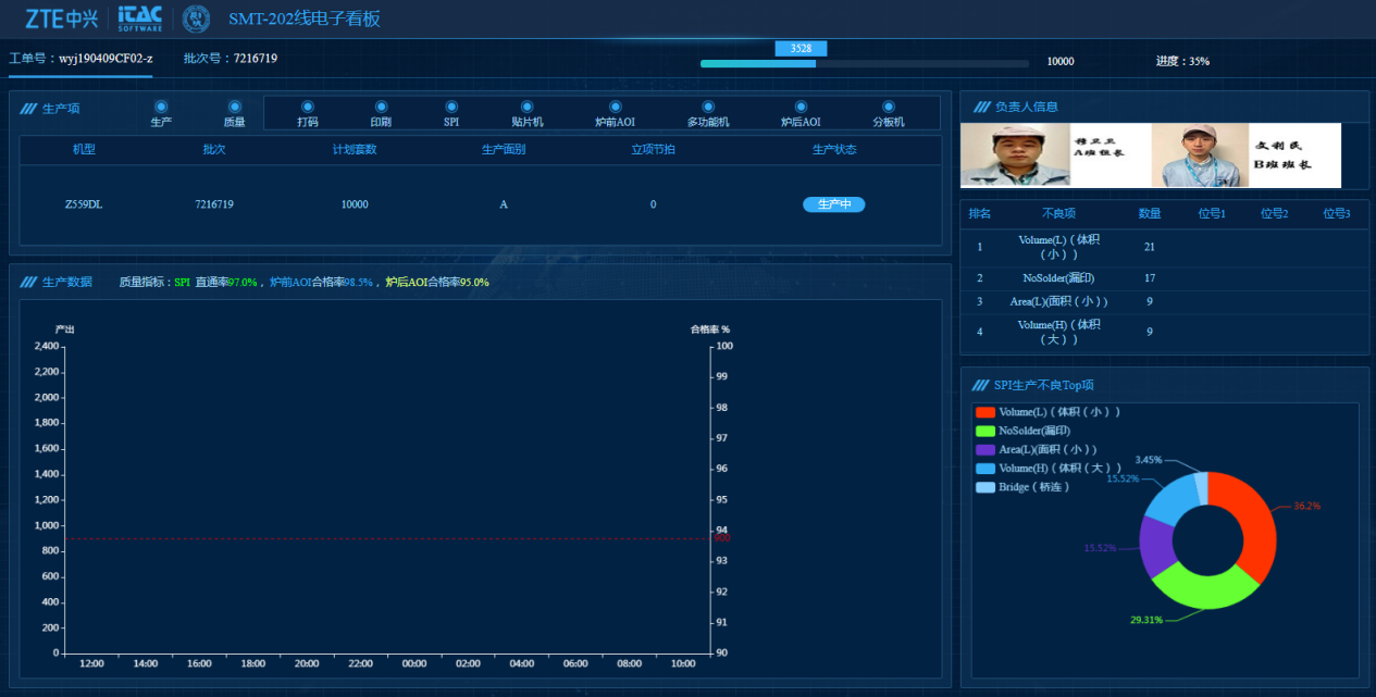 關鍵工位的采集數據都與板號關聯,基于設備實時聯機實現產品在制工序全程閉環制程控制、高精度的單板物料追溯、SPI/AOI檢測信息追溯、實現(印刷機、前后AOI、SPI和整SMT段)良率、直通率的統計管理,工位的作業數據、生產報警、故障報警等等。