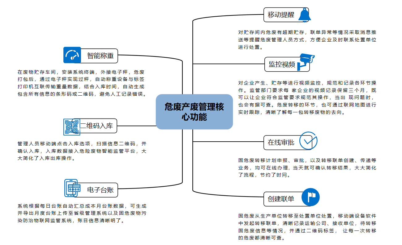 危險廢物產生、收集、貯存、運輸、利用、處置進行全環節管理,目標做到來源可查、去向可追、全程留痕,實現危險廢物產生情況在線申報、管理計劃在線備案、轉移聯單在線運行、利用處置情況在線報告和全過程在線監控。可以說,做到危險廢物無論種類多少、數量大小及來自何處,均納入系統線上監管,真正做到應管盡管。