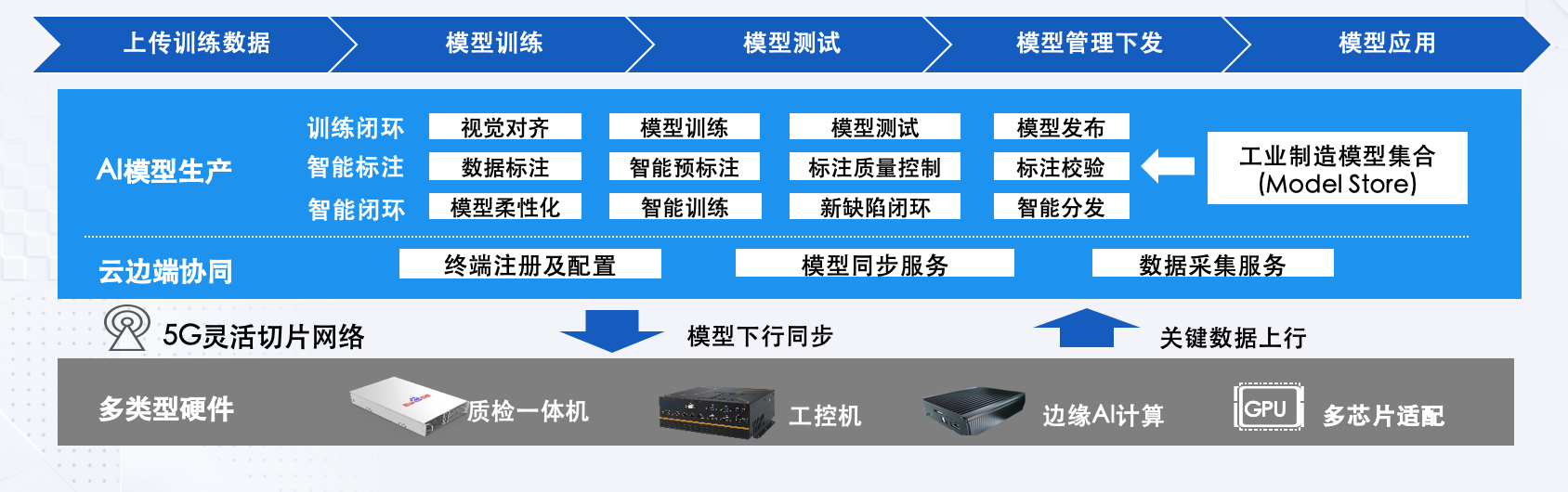 百度智能云提供全套的視覺解決方案,針對工業視覺需求推出百度工業視覺智能平臺,提供圖形化AI訓練平臺,可以“0”代碼基礎的操作進行模型自訓練和優化,包括視覺對齊、數據標注、模型訓練、模型評測、模型下發等功能。預測、模型訓練采用端云一體模式,構建了利用缺陷數據實現模型預測準確率的不斷優化升級的閉環。模型云端訓練、模型快速下發至邊緣節點、模型通過邊緣計算進行缺陷預測,邊緣節點采集的數據上傳到云端反哺模型訓練迭代。