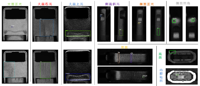 自動化部分,設計部署了18個相機和光源,對零件外表面和內腔實現流水線級別的圖像拍攝,在不同光源下對物體六個外表面及內腔拍攝18張圖像,實現了360度圖像采集。