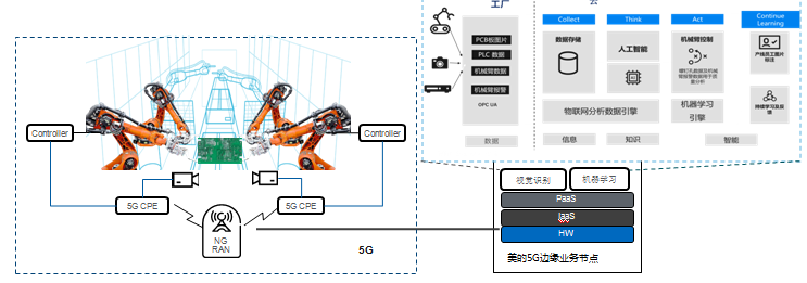 (2)機器視覺缺陷檢測:通過部署超高清攝像頭采集PCB電路板的圖像,并結合5G網絡大帶寬、低延時特性,將數據傳輸至部署在邊緣云上的圖像分析系統,自動判斷PCB是否存在缺陷,并反饋分析結果, 未來,還將部署分揀機器人可根據圖像識別系統結果挑出不良產品。