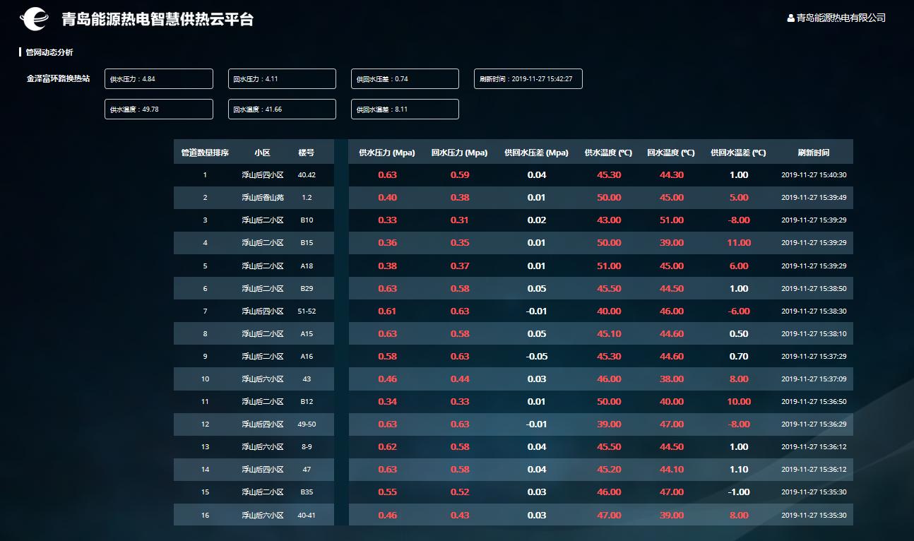 智慧供熱云平臺能夠提供基于專業供熱數據的大數據挖掘與可視化分析展現功能,通過整合熱源、換熱站、管網、氣象、熱用戶數據及客服系統反饋信息,形成全熱網統一的大數據挖掘分析平臺,幫助青島能源熱電有限公司及下屬熱力分公司掌握全熱網供熱各個環節運營狀況及客戶滿意度,通過整合現有粗放、零散、低效的數據資源,實現熱網的統一信息化協調監管,針對性改善服務質量,提供個性化服務,為節能降耗、運營管理和日常運作提供重要指導和支持。