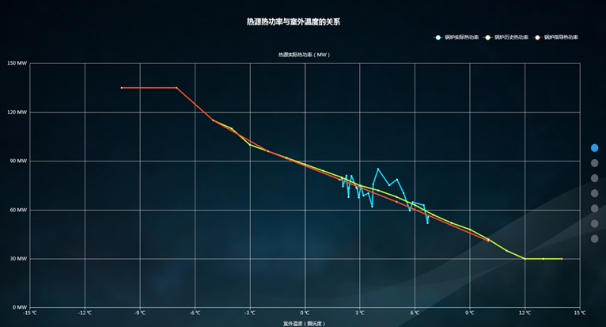 基于大量歷史數據,得出一次網供熱溫度在不同工況下的純延遲與慣性時間。基于熱源機理與數據驅動,建立精確的熱源預測模型,通過該模型得出熱源在室外溫度改變時,預測的熱源功率優化曲線。進而保證合理的供熱量,保證換熱站的熱量供給,如下圖所示。