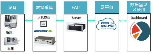 從底層數(shù)據(jù)采集到數(shù)據(jù)邊緣運(yùn)算,并通過(guò)WisePaas Dashboard呈現(xiàn),實(shí)現(xiàn)數(shù)據(jù)的可視化。初步擬定以車床車間和銑床車間為一期工程,提供開放式系統(tǒng)平臺(tái),全面實(shí)現(xiàn)設(shè)備聯(lián)網(wǎng)、數(shù)據(jù)采集,數(shù)位化智能管理等預(yù)期。在一期工程完成后,借助研華方案強(qiáng)大的可擴(kuò)展性,在系統(tǒng)架構(gòu)上可彈性實(shí)現(xiàn)其他廠區(qū)車間的工程布建。