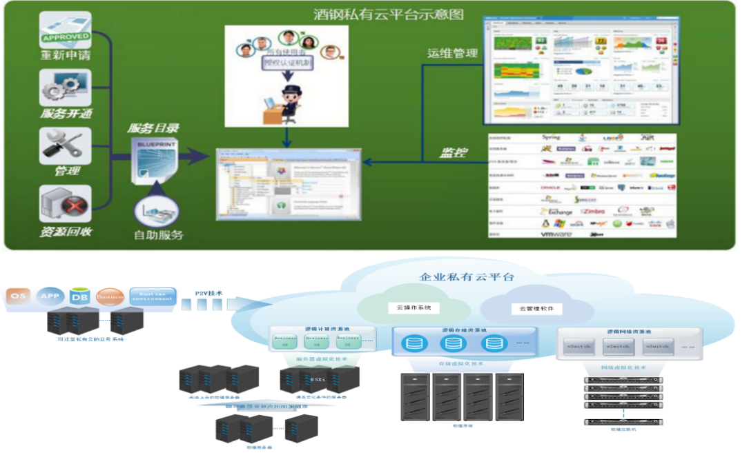 (2) IT架構(gòu) 目前采用工業(yè)私有云架構(gòu),底層將計(jì)算、存儲、網(wǎng)絡(luò)資源進(jìn)行虛擬池化,上層搭建云門戶,建立服務(wù)目錄和自助服務(wù)流程,按照用戶需求,實(shí)現(xiàn)自動化部署和安全防護(hù)。